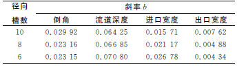 在盡量減小數(shù)值誤差影響的前提下,為比較各參數(shù)對(duì)流量的影響程度,采用最小二乘法對(duì)各曲線進(jìn)行線性擬合,得到各擬合曲線的斜率b值,見(jiàn)表2。通過(guò)比較斜率b值的大小,就可得出各參數(shù)在其變化范圍內(nèi)對(duì)流動(dòng)的影響程度。由表2可知,在各參數(shù)的變化范圍內(nèi),流道深度對(duì)流量的影響最大,進(jìn)口寬度和倒角次之,出口寬度最小。