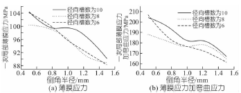 圖5 徑向槽數(shù)不同時(shí)倒角半徑對(duì)應(yīng)力的影響