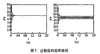 理想情況下,控制閥的摩擦引起的非線性是忽略的,其過程的趨勢(shì)曲線如圖3(a)所示。采用圖1所示的反饋控制,控制器使用常規(guī)的線性PID控制,調(diào)節(jié)閥為氣動(dòng)調(diào)節(jié)閥,使用數(shù)據(jù)驅(qū)動(dòng)模型來模擬實(shí)際的控制閥,數(shù)據(jù)驅(qū)動(dòng)模型的參數(shù)設(shè)置為:S=5,J=2。其中S表示死區(qū)加粘連,J表示滯跳。通過仿真來得到PV和OP的時(shí)間序列,為分析控制閥的非線性提供數(shù)據(jù)。由于控制閥的模型是非線性的,導(dǎo)致整個(gè)控制系統(tǒng)是非線性的,而采用的控制器是線性的,這種非線性導(dǎo)致過程出現(xiàn)震蕩(15),其過程值的趨勢(shì)曲線如圖3(b)所示。