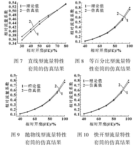 (卻△p= 0. 1 MPa)的環(huán)境中得到。小開度時因內(nèi)部結(jié)構(gòu)產(chǎn)生的較大阻力對理想流量特性的影響,為驗證工作流量特性隨著閥門開度的變化是否滿足設(shè)計要求,檢測偏離程度的影響,采用FLUENT軟件仿真驗證套筒窗口形狀設(shè)計。
