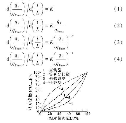 調(diào)節(jié)閥的流量特性,是指調(diào)節(jié)閥在某一行程下流量口與全開時的流量口max之比的相對流量(Q/Qmax )與某一行程l與全開行程l的相對開度(l/L)之間的函數(shù)關(guān)系,表示為Q/Qmax =f (l/L)。相對開度是利用執(zhí)行器驅(qū)動閥桿控制閥瓣與套筒沿套筒軸向的相對位置,改變套筒節(jié)流而積大小實現(xiàn)控制閥流量的調(diào)節(jié)。流量特性的研究是除總體結(jié)構(gòu)、密封和壓力自平衡研究外的一項關(guān)鍵。然而在實際工況中,由于多種因素的影響,閥門前后壓降不穩(wěn)定將導(dǎo)致介質(zhì)流量不斷變化,為了便于分析,在設(shè)計過程中通常設(shè)定閥門壓降恒定,再根據(jù)實際工況進行修正,兩者分別稱為固有流量特性和工作流量特性圖。其中固有流量特性根據(jù)應(yīng)用場合不同主要分為直線、等百分比(對數(shù))、拋物線及快開特性4種因,如圖1所示,通過相對流量和相對位移之間不同數(shù)學(xué)表達式(1)一式(4)分別進行計算,其中K是常