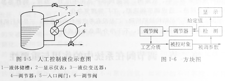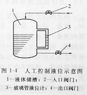 圖1-4所示是人工控制液位示意圖。液體連續不斷地通過入口閥門2流入儲槽1,同時又不斷地通過出口閥門4流出。可以看出,槽內液位將隨著流入量或流出量而波動,波動嚴重時,槽內流體可能溢出或抽空。要解決這個問題,使液位保持在某一范圍內,最簡單的辦法是安裝一個玻璃管液位計3。以液位計的上、下限刻度線為標準,當液位上升到接近上限刻度時,可以開大出品閥門的開度,或關小進口閥門的開度;當液位下降到接近下限刻度時,可以關小出口中閥門或開大進口閥門的開度,這樣就避免了儲槽因液位過高而溢流,或因液位下降而抽空的事故發生,使液位保持在某一范圍內。這個過程是由人直接控制的,所以叫人工控制。