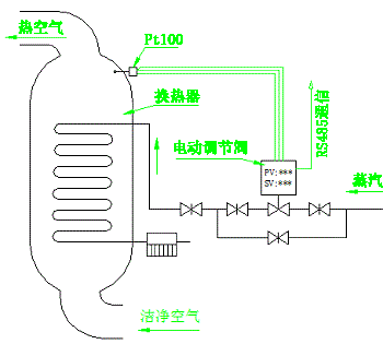 靜化空氣通過換熱器加熱后,將相對恒定的風量送入培育室,要求送風的溫度相對恒定。加熱源為蒸汽,采用集散控制方式,控制工作由溫控單元獨立完成,控制過程由中控系統實時監控。