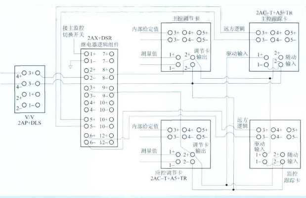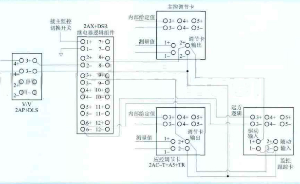 正常情況系統在主控模式下運行。此時,2+、2-為常閉觸點,3+、2-為常開觸點,6端為低電平時,觸發應控跟蹤卡工作。應控跟蹤卡的輸入引自繼電器邏輯組件2-端,輸出到3+端,使得2+端和3+端電位相同,實現跟蹤主控調節卡的功能。