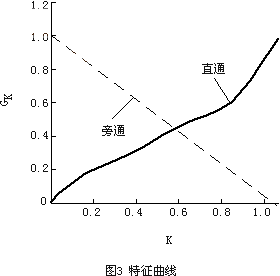 特征曲線包括直通曲線與旁通曲線,要實(shí)現(xiàn)定流量,兩條曲線可能有多種組合,但這兩條曲線組合并非是任意的,第一,要符合實(shí)際,即在制造工藝上是否可行;第二,要利于將來的調(diào)節(jié)。為有利于動(dòng)態(tài)調(diào)節(jié),將直通曲線設(shè)為線性的,旁通曲線由直通的線性決定。即直通曲線為