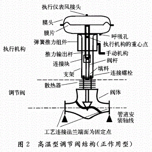 a)高溫(蒸汽介質(zhì))環(huán)境中,大多會(huì)出現(xiàn)填料泄漏故障,內(nèi)件易損壞(閥芯閥座磨損失配、閥芯脫落),內(nèi)部泄漏量大,不易控制,調(diào)節(jié)品質(zhì)差,與工藝連接的法蘭端面很容易泄露等故障。圖1,圖2分別為普通調(diào)節(jié)閥和高溫型調(diào)節(jié)閥結(jié)構(gòu)。從圖中可以看出,由于加了一截散熱器的距離,使用溫度越高散熱器就越長,因此,高溫型調(diào)節(jié)閥執(zhí)行機(jī)構(gòu)重心點(diǎn)距安裝軸線的距離,比普通型調(diào)節(jié)閥要長的多,非垂直安裝調(diào)節(jié)閥產(chǎn)生的力矩也要大得多。如:動(dòng)力C鍋爐裝置的幾臺(tái)減溫減壓調(diào)節(jié)閥,合成氨裝置的調(diào)節(jié)閥等。