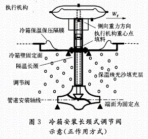 b)低溫(小于-100℃)深冷使用環(huán)境中,出現(xiàn)較多的也是填料泄漏故障。此類調(diào)節(jié)閥有較長的隔熱絕冷長頸,所處的環(huán)境溫差大,大多安裝使用在空分、液氮洗單元裝置上,它們基本上都有兩個(gè)支撐點(diǎn),如圖3所示。管道和冷箱箱壁都是固定點(diǎn),一端固定在管道、設(shè)備上,另一個(gè)就固定在保溫冷箱的邊壁上,閥體和長頸部分基本是固定死的,只有執(zhí)行機(jī)構(gòu)是側(cè)懸在冷箱壁之外的,如果執(zhí)行機(jī)構(gòu)太重并發(fā)生形變,受力點(diǎn)就在填料處,則填料處最易受力單邊磨損。空分、液氮洗(深冷)單元除箱頂安裝的調(diào)節(jié)閥以外,基本上都屬側(cè)裝和水平安裝。如:合成氨液氮洗裝置的調(diào)節(jié)閥,空分裝置的調(diào)節(jié)閥。
